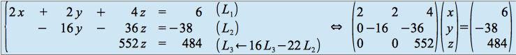 On obtient ainsi un système triangulaire, qu'il est alors facile de résoudre, en commençant par déterminer la variable