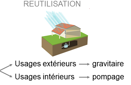 Lorsqu'une récupération des eaux de pluie est mise en place, l'eau potable est substituée par les eaux collectées pour une partie seulement des usages.
